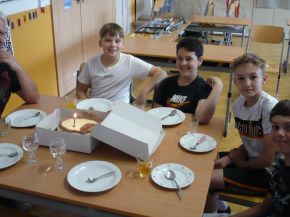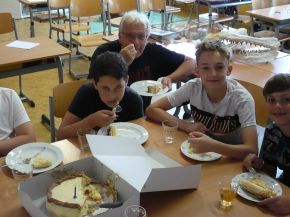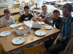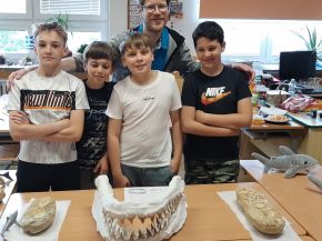 Na jedné z přírodovědných laboratorních prací některé žáky velmi nadchly fosilní ukázky: trilobit a žraločí zub. Tím se sbírka zkamenělin ve třídě začala rozrůstat. Ve školním roce 2024/2025 probíhal na naší škole paleontologický kroužek o evoluci života na Zemi s názvem Badatelství nad zkamenělinami živočichů. Mimo něj se někteří ve škole účastnili ještě odborných seminářů, kde preparovali fosilní vzorky z marocké horniny. Nejúspěšnějším počinem malých paleontologů (Davida Maliňáka, Ivana Suliatatchiiho, Matyáše Šťovíčka a Vlastimila Lokajíčka) byla bezpochyby rekonstrukce čelisti vyhynulého obrounovitého žraloka druhu Otodus obliquus. Žil zhruba před 50 miliony lety a dorůstal do délky 9-12 metrů! Rekonstrukce probíhala od listopadu 2023 do prosince 2024. Po poradě s americkým odborníkem na vyhynulé žraloky Jimem Bourdonem a paleontologem Jiřím Vedralem (z pražské dílny preparující i pro Národní muzeum) jsme s dětmi dílo dokončili. Žraloka pojmenovaly Ota. Na 5. červen 2025 připadlo slavnostní odhalení čelisti, kdy jsme oslavili pomyslné Otíkovy 1. narozeniny. Bylo nám ctí, že pozvánku na oslavu přijal i pan Vedral. Nejprve došlo na žraločí píseň. Zkomponována pro tuto příležitost byla Mgr. Vitíkem a jeho žákem Ivanem Suliatatchiim, kteří doprovodili její nacvičený sborový zpěv na kytary. A po narozeninovém dortu byla „tlama“ slavnostně odhalena, včetně fragmentu páteře. Paleontolog zhodnotil rekonstrukci čelisti jako velmi zdařilou. Vyfotili jsme se a závěr zaplnily paleontologické diskuse o zajímavostech. Pak už to bylo na Otíka moc, a tak jsme se všichni rozloučili. Po svém úspěchu uvítáme do klubu další zájemce o bádání nad zkamenělinami vyhynulých tvorů, již si téhle planety vážili více než nicotný člověk.