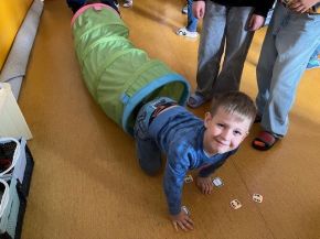 Poté je v tělocvičně čekalo několik stanovišť inspirovaných známými postavičkami. S Bobem a Bobkem skákali v pytlích, u Večerníčka házeli čepici do kruhu, s Krtečkem se plazili přes lavičku a váleli sudy, u Maxipsa Fíka skákali přes švihadlo a u Manky s Rumcajsem se vyhýbali pařezům v lese Řáholci. U postaviček Pat a Mat skákali s míčem mezi kužely jako praví kutilové-popletové.