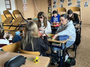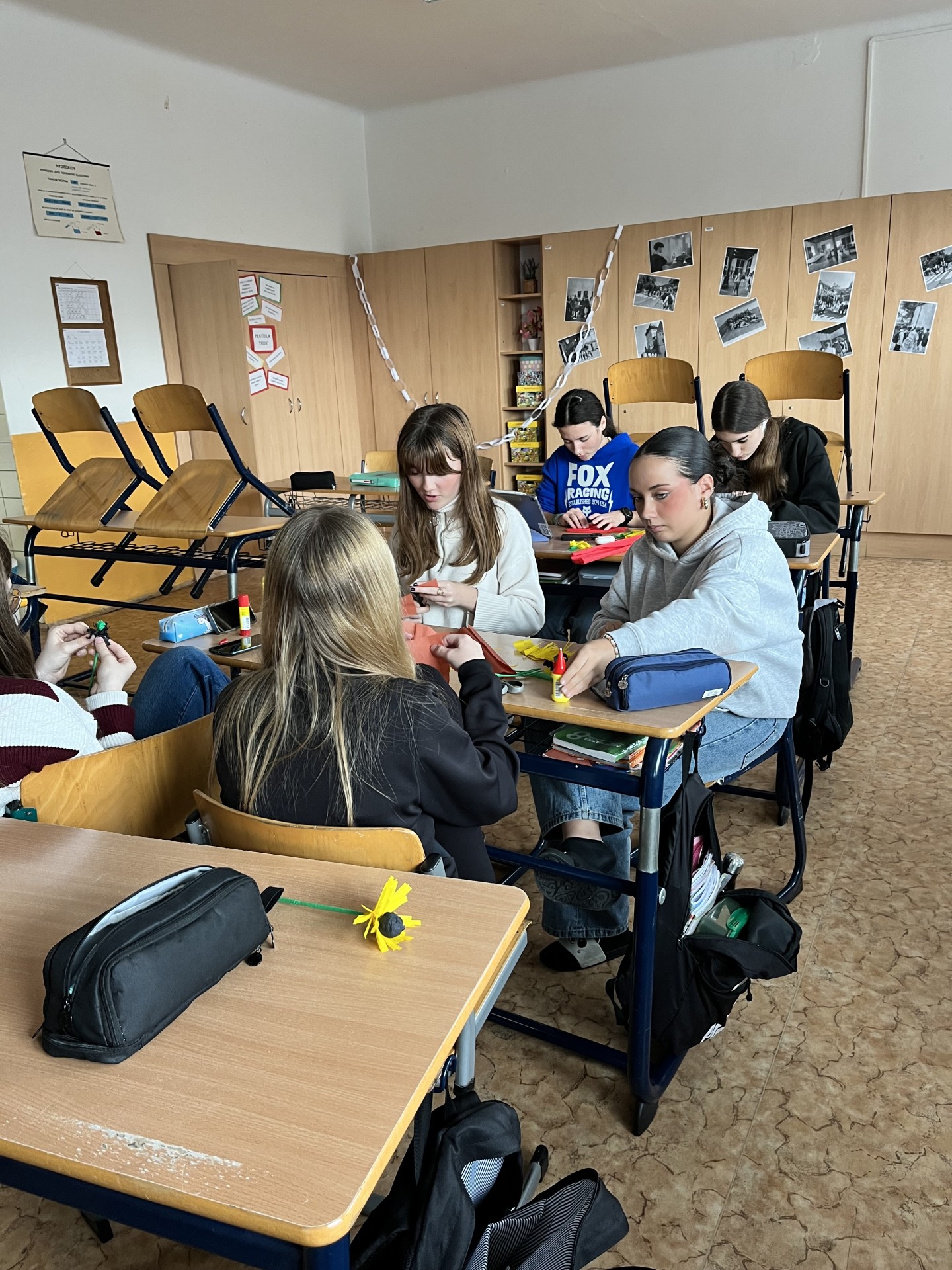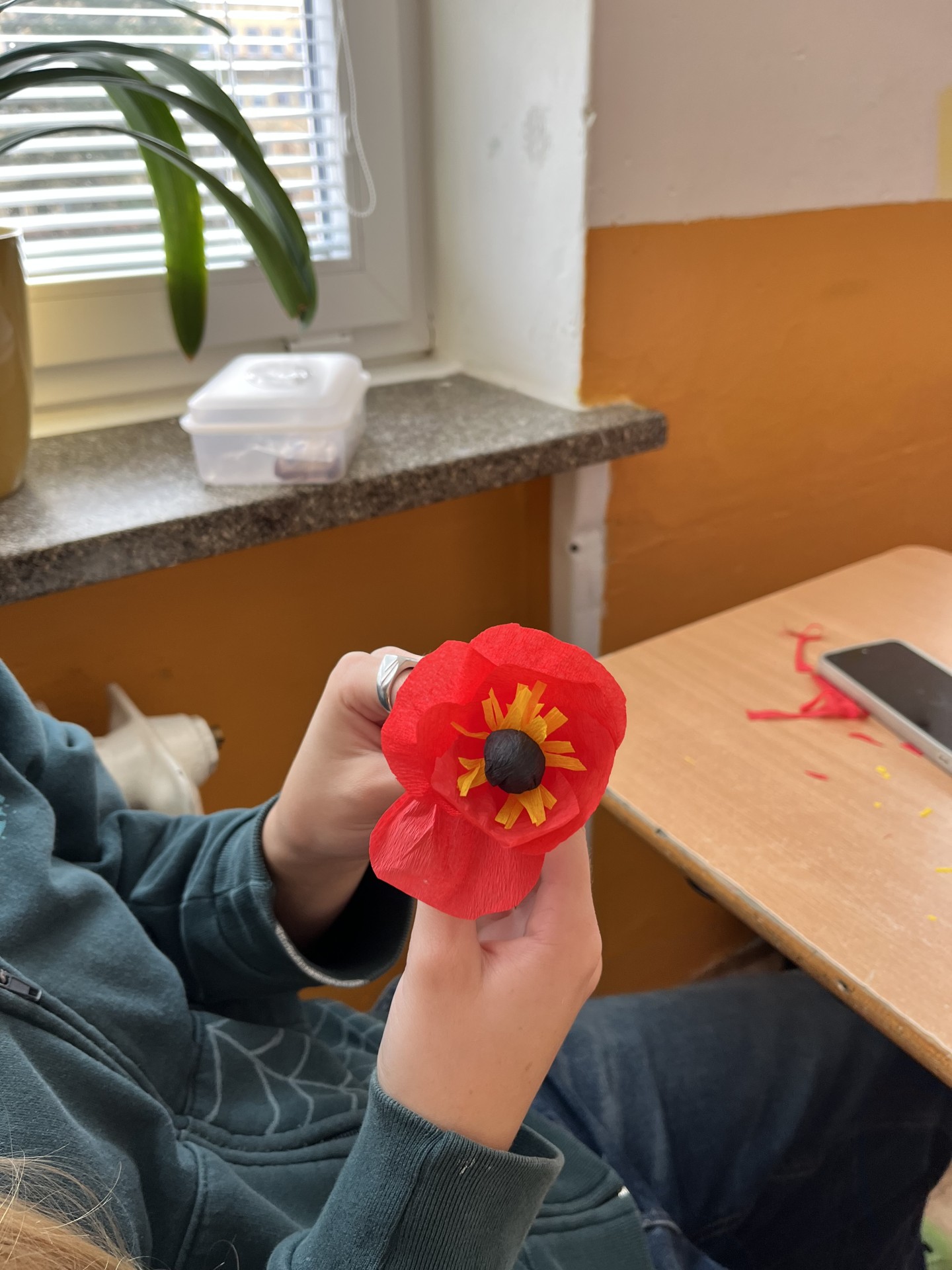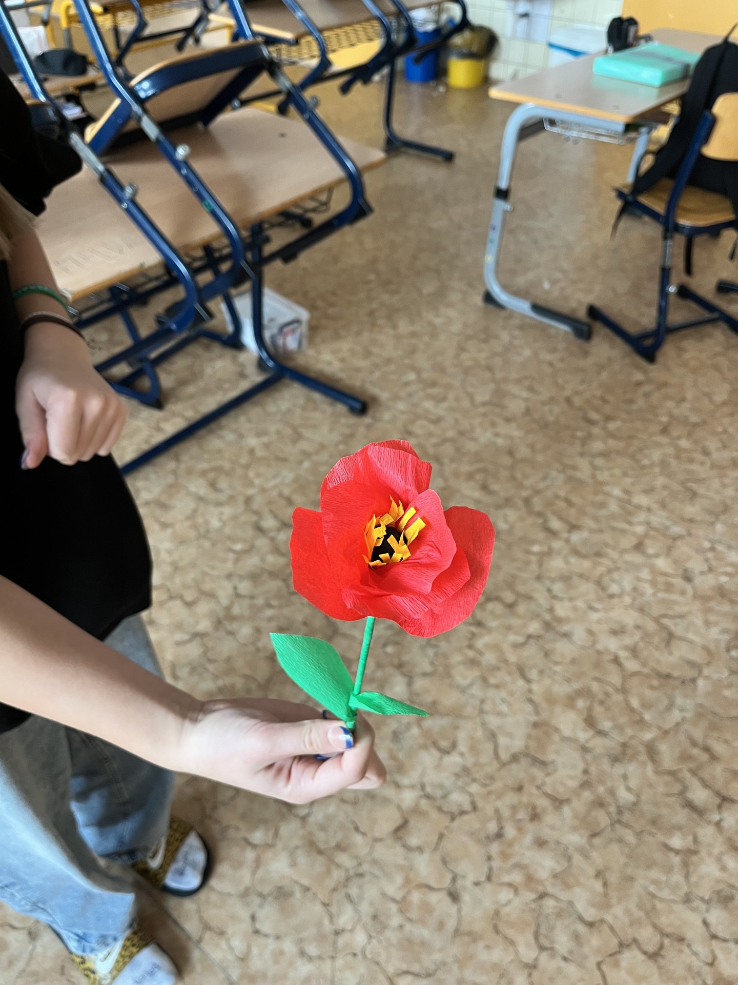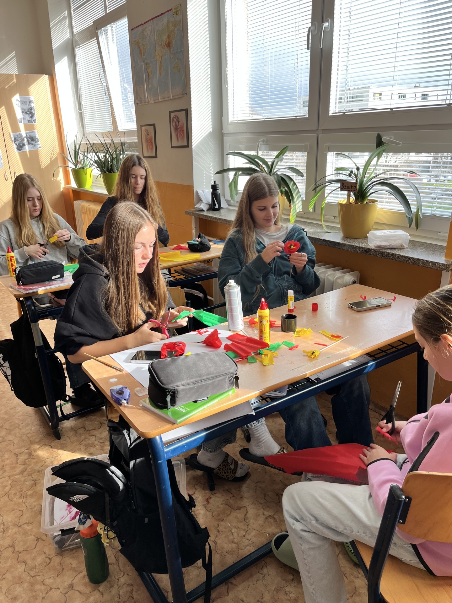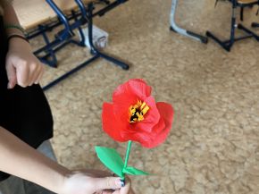 Poté se dívky pustily do samotné výroby. Pomocí červeného a černého krepového papíru vytvářely jemné okvětní lístky a středy květů. Každý mák byl trochu jiný, ale všechny se povedly opravdu krásně. Hotové květy nyní zdobí školní třídu nebo si je dívky odnesly domů jako vlastní vzpomínku na tento významný den.