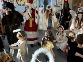 Výběr letošních deváťáků se postaral o krásný a autentický zážitek pro děti ze dvou školek na Slovanech. Ve čtvrtek 5. 12. šli 4 dívky a 4 chlapci z 9. A v převlečení čertů a andělů v čele s Mikulášem nejprve do 21. MŠ. Tam navštívili celkem 4 třídy, od úplně nejmenších dvouletých dětiček po předškoláky, kteří měli pro strach uděláno. Poté se přesunuli do 38. MŠ, kde postrašili děti ve všech třídách, včetně paní kuchařek. Následovala ještě jedna třída na odloučeném pracovišti Tetur na Koterovské.