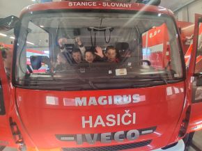 Součástí programu byla také prohlídka garáže se zásahovými vozy. Mohly si zblízka prohlédnout hned několik typů techniky, včetně nejnovější čtyřkolky Polaris. Velkým zážitkem bylo také usednutí za volant hasičské Scanie a možnost prozkoumat automobilový žebřík Iveco, dokonce i zespodu pod výsuvnou konstrukcí.