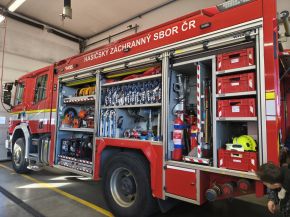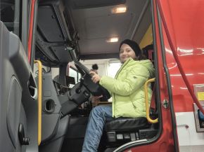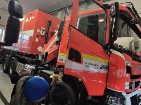 Součástí programu byla také prohlídka garáže se zásahovými vozy. Mohly si zblízka prohlédnout hned několik typů techniky, včetně nejnovější čtyřkolky Polaris. Velkým zážitkem bylo také usednutí za volant hasičské Scanie a možnost prozkoumat automobilový žebřík Iveco, dokonce i zespodu pod výsuvnou konstrukcí.